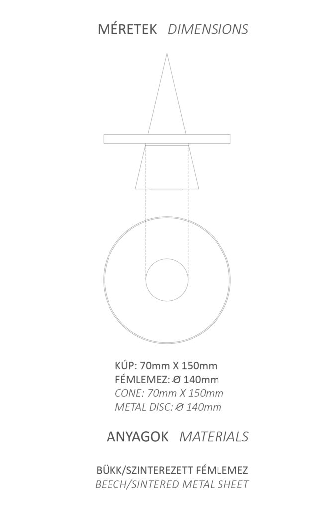 ékszertartó Fa és fém kombinációja. Egy ékszertartó egyszerű geometrikus formákból. A tányér szinterezett fémlemez, a kúp esztergált bükkfa. jewelry holder A combination of metal and wood. A jewelry holder made up of simple geometrical forms – a sintered metal disc and a central turned beech cone.