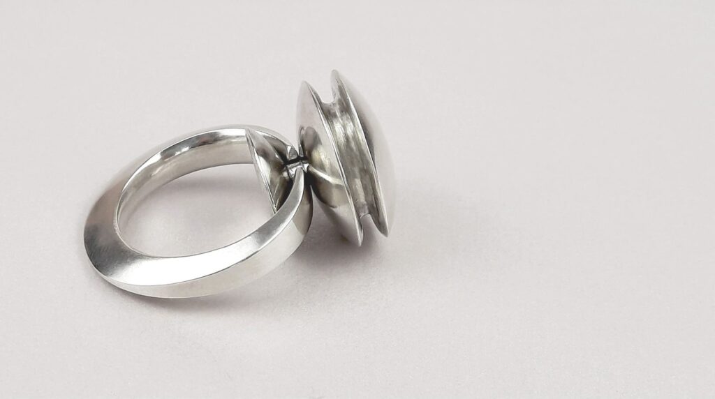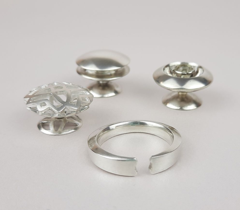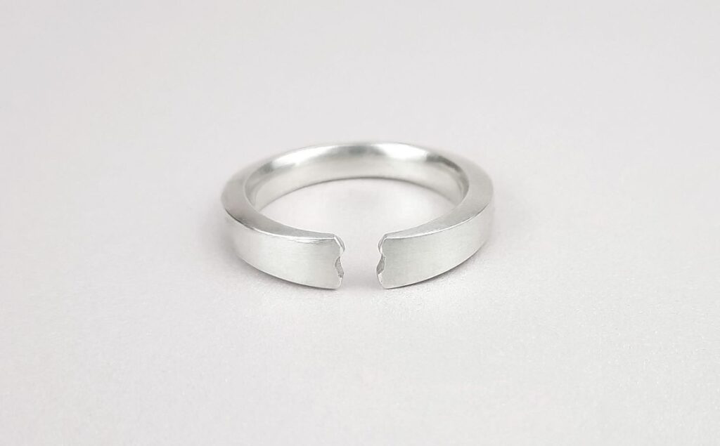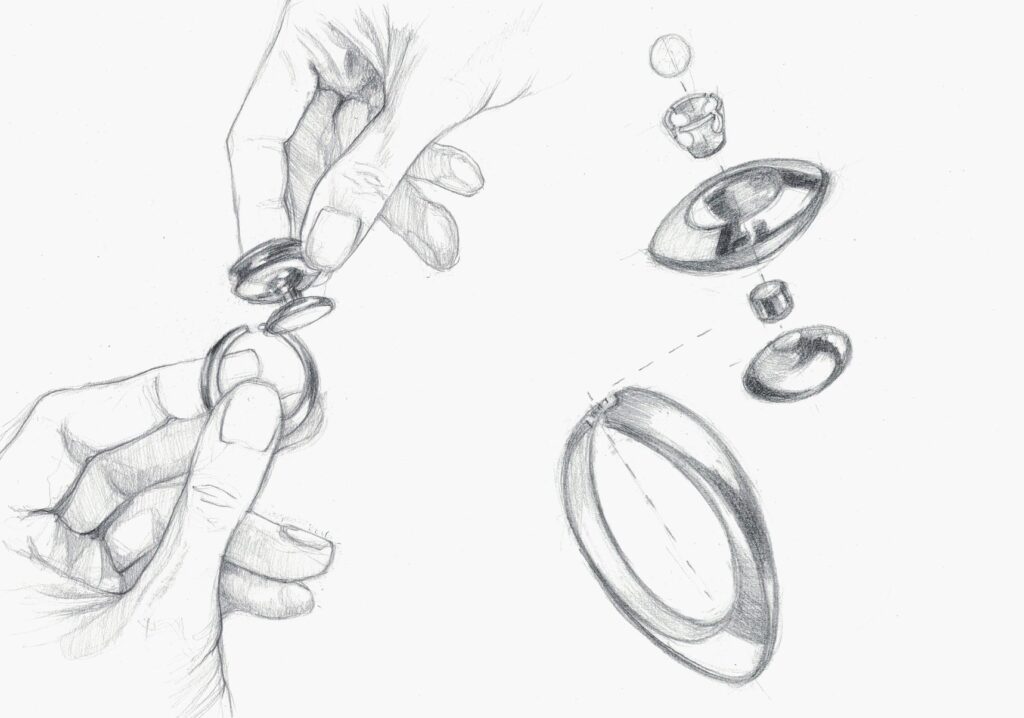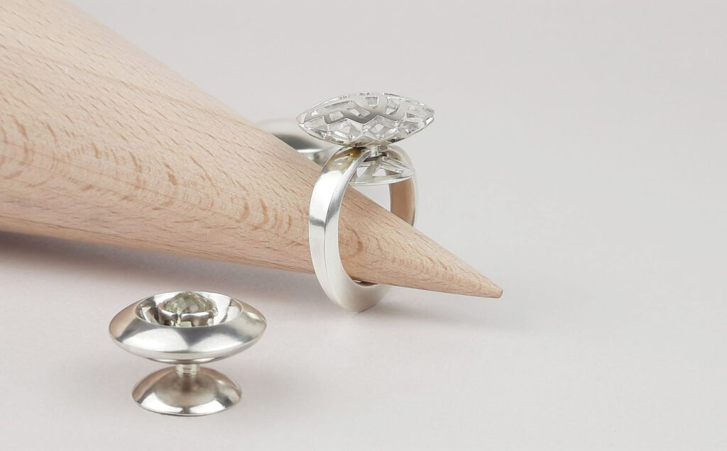 A tension ring with interchangeable heads. The heads pop into the gap of the shank and can be removed and changed with a simple turn. The number of possibe heads is endless, the presented collection includes three heads that were created with different techniques.